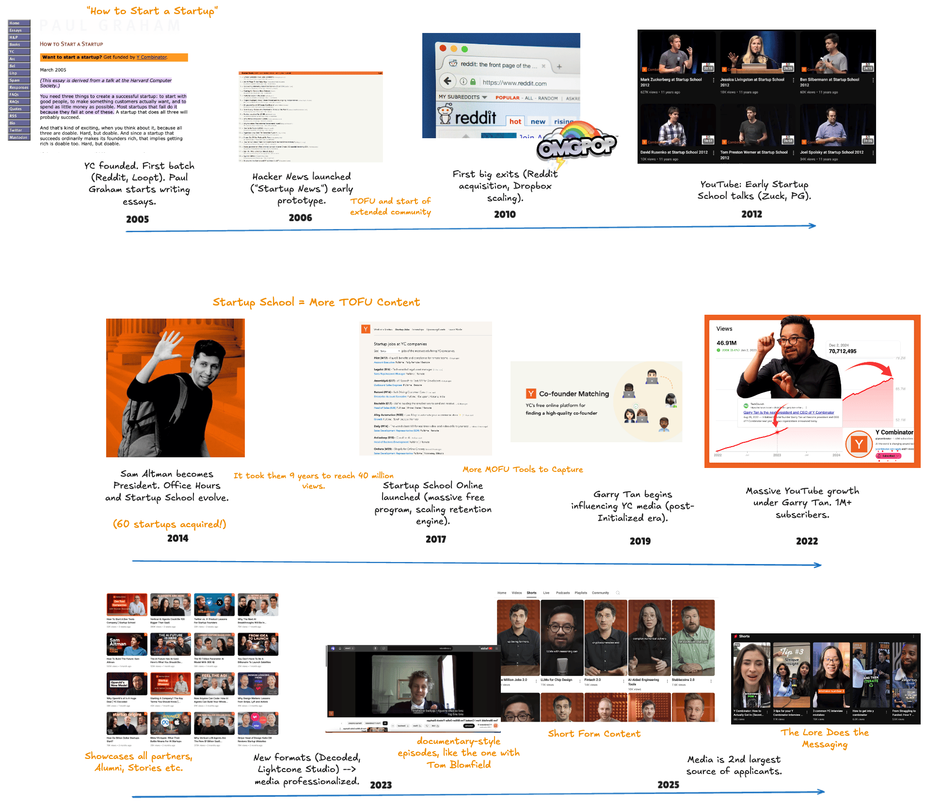 Startup School, PG essays, the podcast, hackernews, the alumni network - all of it maps directly onto what early-stage founders are trying to figure out at the moment they need it.