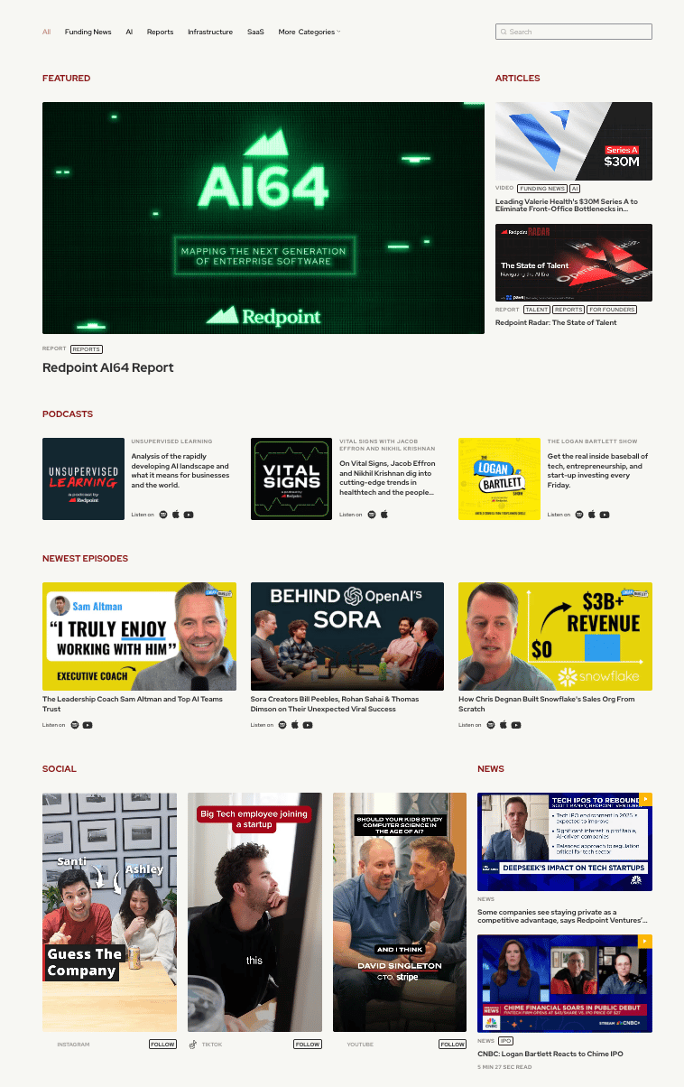 Sequoia is putting in a lot of effort to create very high-quality content across various streams. They have high-frequency podcasting and video, then lower-frequency, higher-impact thought leadership pieces in blog format. Because of their brand, this carries and travels incredibly well. They use this content to reinforce the idea of being the gold standard in venture + have a very good balance between macro thought leadership from partners and showcasing founder stories.