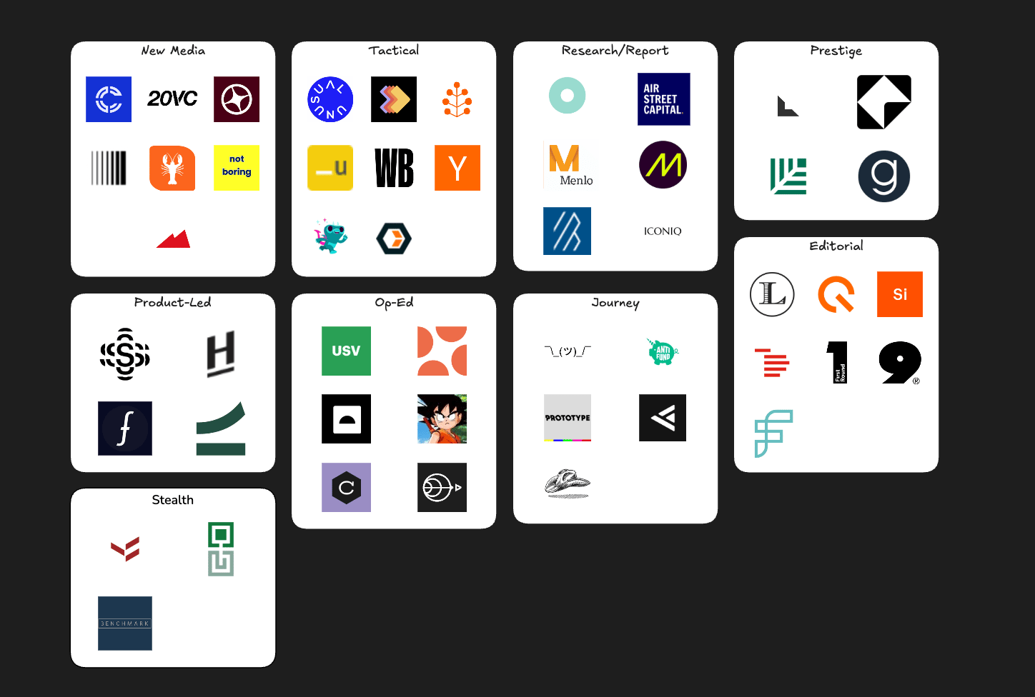 Obviously VC is fairly constrained in its media output compared to other industries. But there's a lot more breadth and creativity than just newsletters, LinkedIn or zoom podcasts. Hopefully this helps you see the various styles across the similar formats….