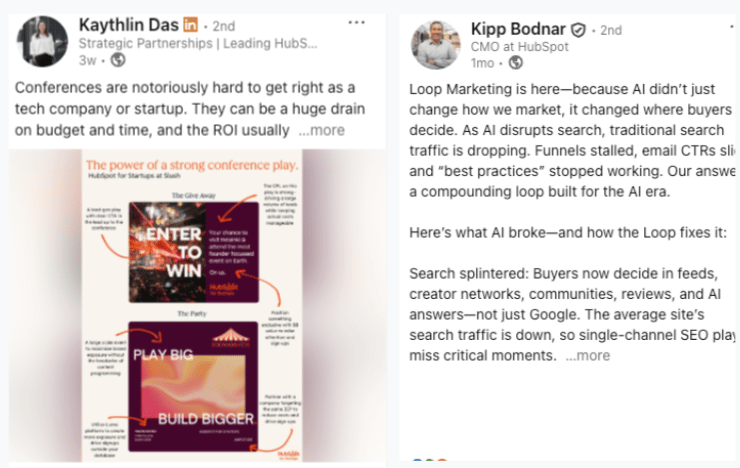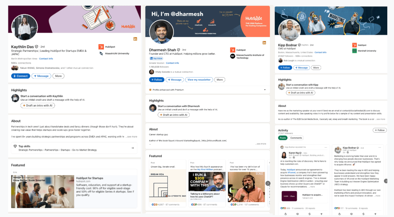 Dharmesh (CEO) posts about leadership and company, Kipp (CMO) posts about marketing and Kaythlin (startup lead) posts about conferences and early-stage. Each has super-optimised profile tied to HubSpot. When they coordinate, it compounds across the whole team.