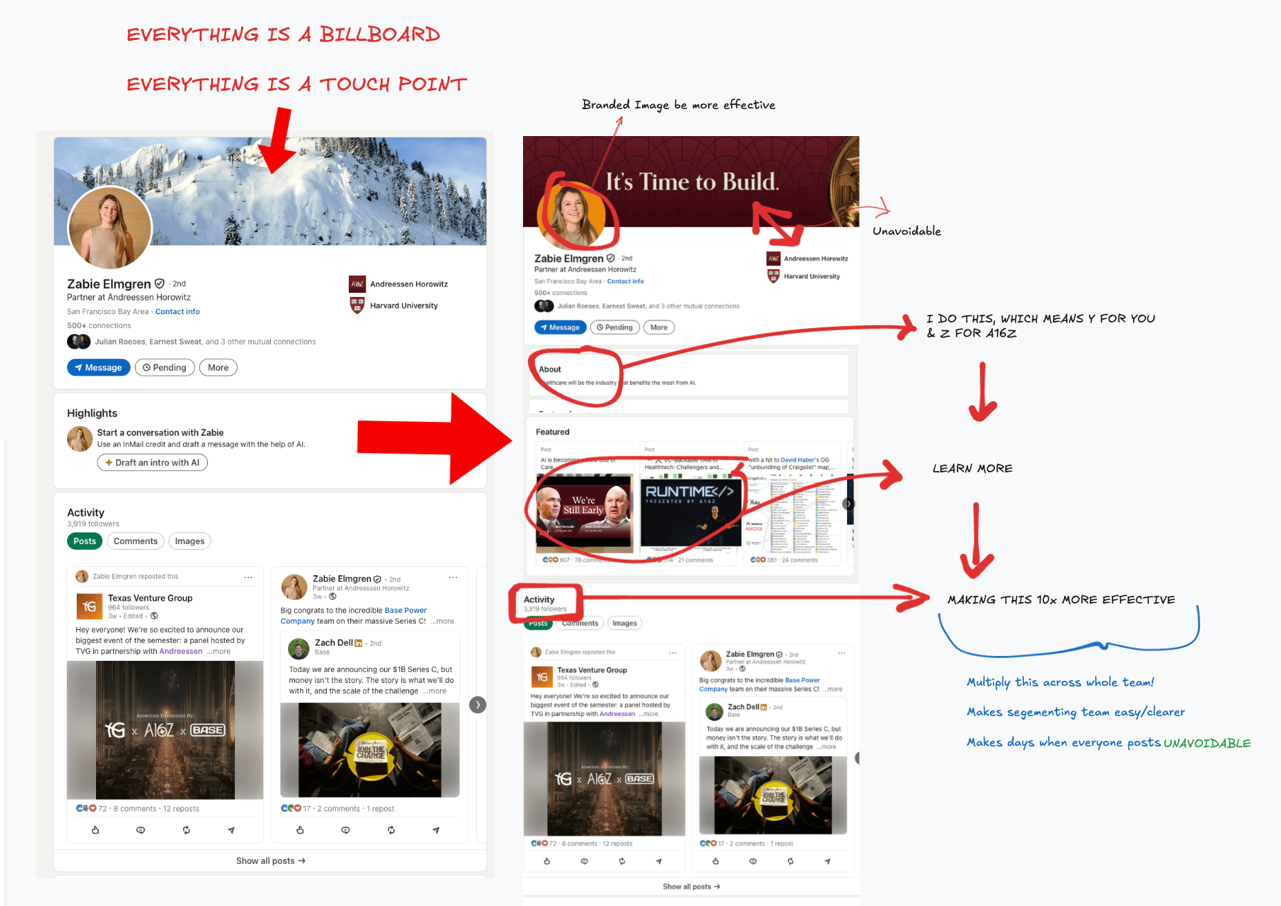 Build workflows e.g. When we invest, these are the assets we need —> This is how we add personal takes —> This is how we multiply across team.