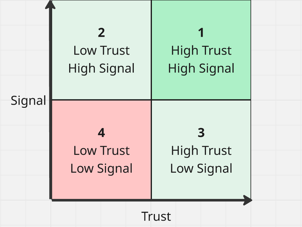 2: Low Trust, High Signal: Salesy content, lead magnets, "DM me to learn more." The information might be useful but the motive is obviously transactional.